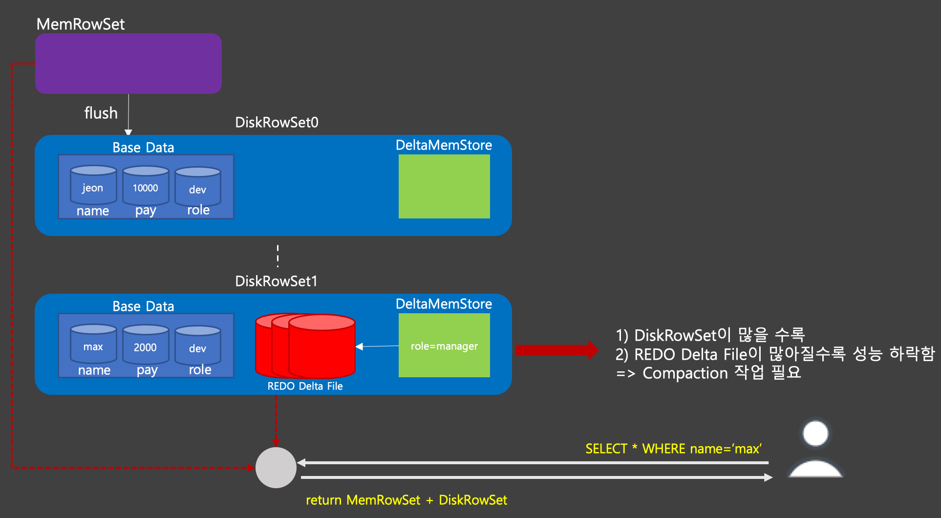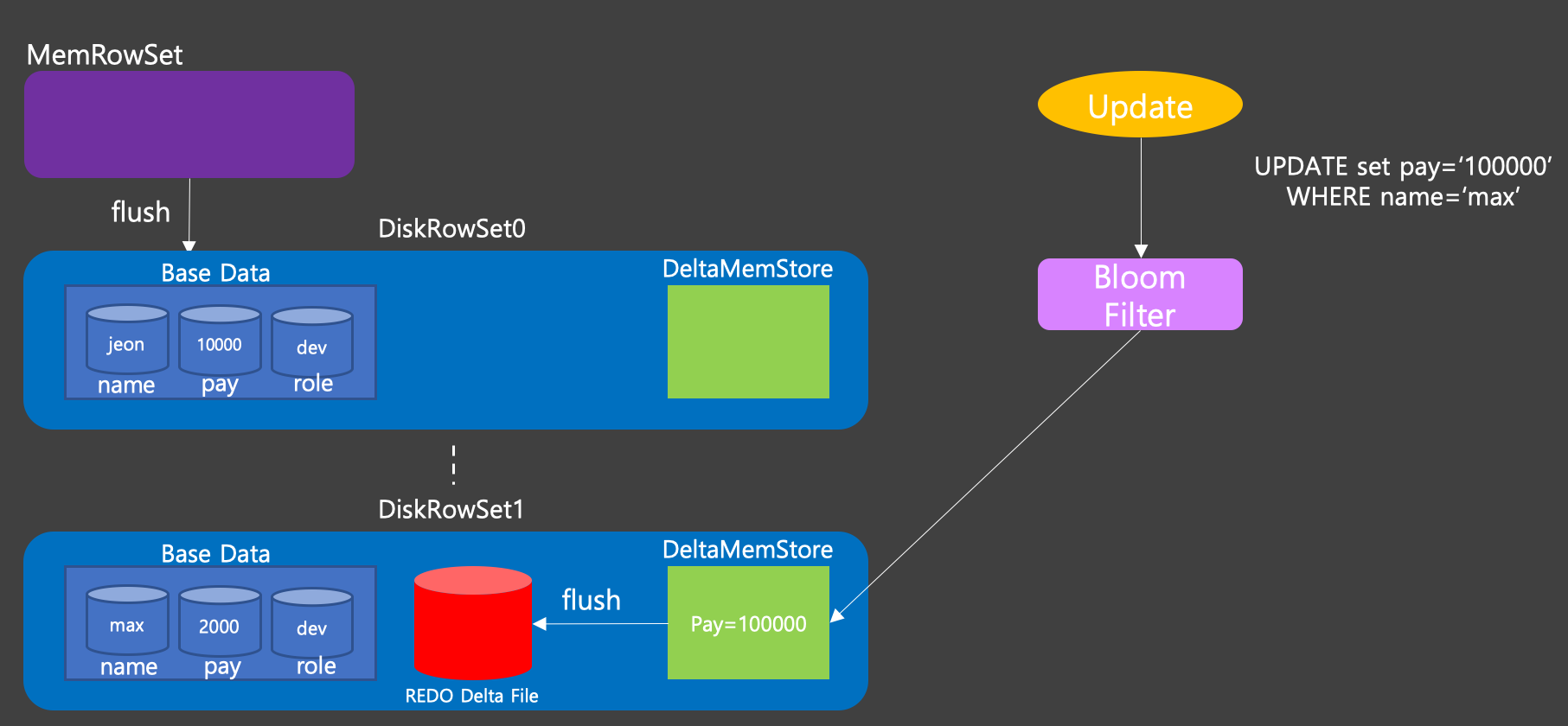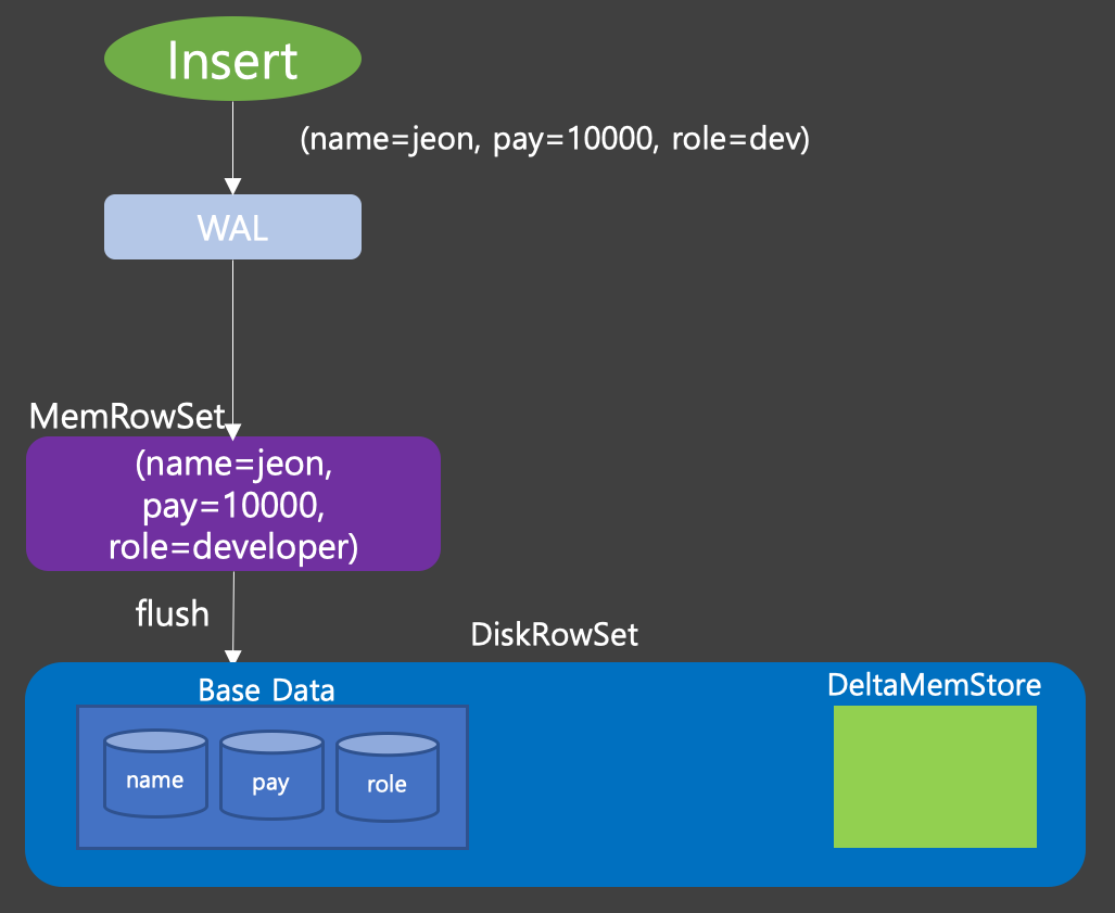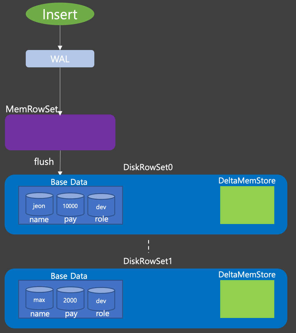 WAL에 쓰고나면 MemRowSet이라고 불리우는 메모리 영역에 데이터를 쓴다. 이 부분에 쌓이게 되다 메모리가 가득차게 되면 디스크에 파일형태로 저장이 되는데 이것을 DiskRowSet 이라고 부른다. DiskRowSet은 Insert Operation을 통해 저장된 데이터인 Base Data와 Update Operation시에 사용할 메모리인 DeltaMemStore로 구성된다.