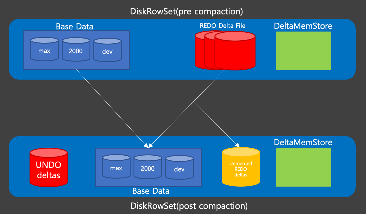 위에 나열했던 것처럼 Compaction이 일어나는 부분은 DiskRowSet에 대한 Compaction과 REDO Delta File에 Compaction으로 나뉜다.