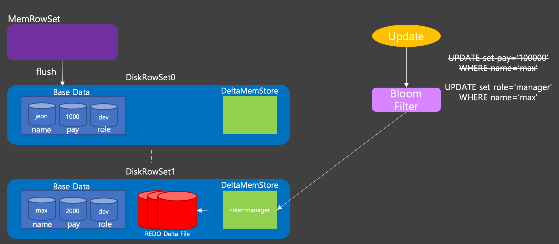 Insert Operation이 MemRowSet이라 불리는 메모리 공간에 먼저 써지는것과 마찬가지로 Update Operation도 DiskRowSet이 가지고 있는 DeltaMemStore라는 메모리 공간에 업데이트 하고자하는 정보가 저장이 된다.