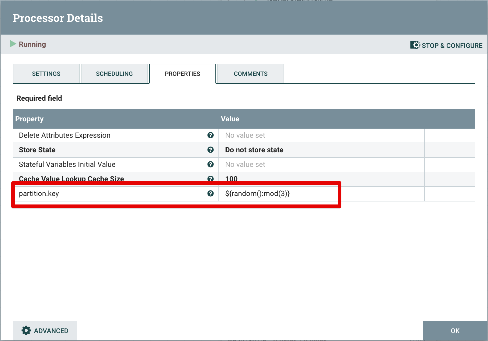 - UpdateAttribute(Primary Node Only) : partition.key라는 Attribute를 생성하고 Modular 연산을 통해 0~2까지의 값이 나오도록 설정