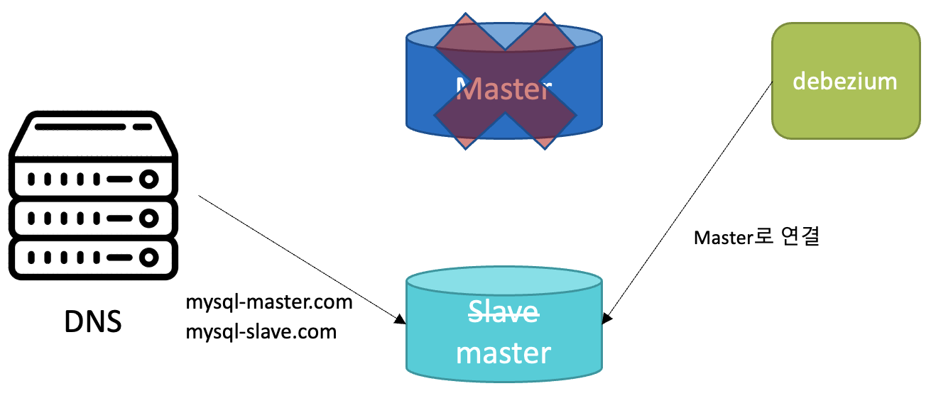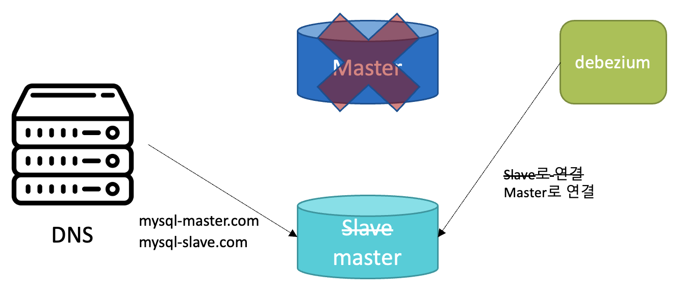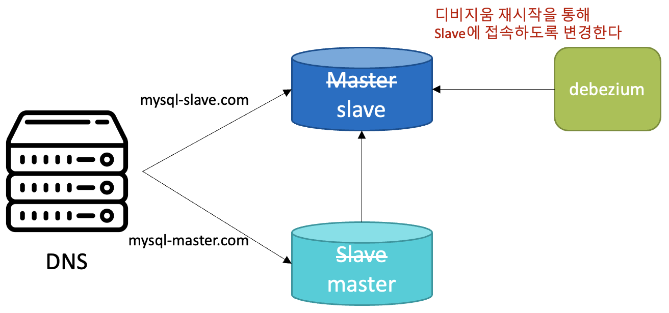 3번작업에 의해 마스터가 슬레이브로 스위칭 되었을때 여전히 디비지움은 마스터였던 서버(스위칭 이후에는 슬레이브)와 계속 커넥션이 맺어진 상태로 CDC를 수행하게 된다.